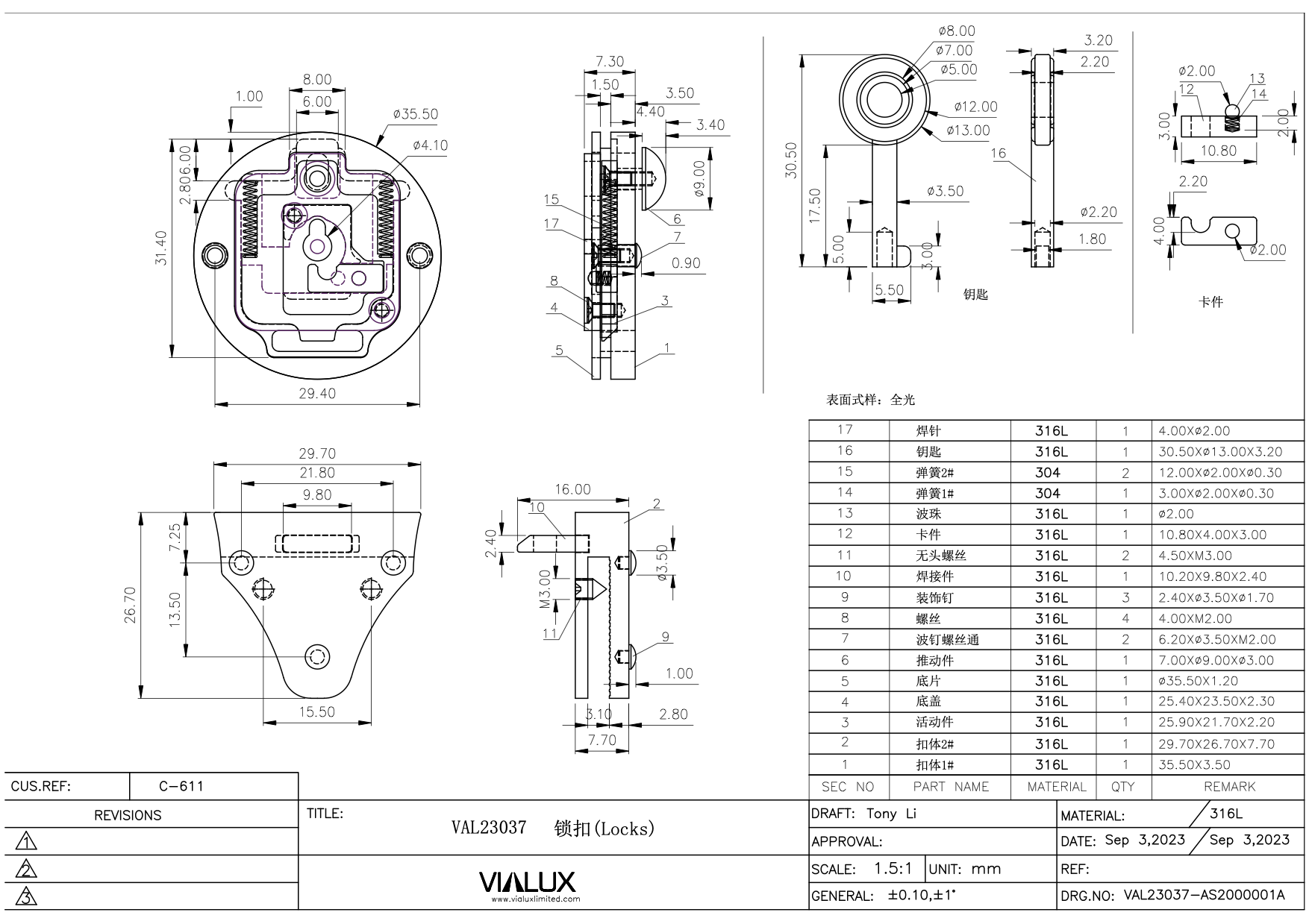 VAL23037 Button Lock Stainless Steel Polished Gold