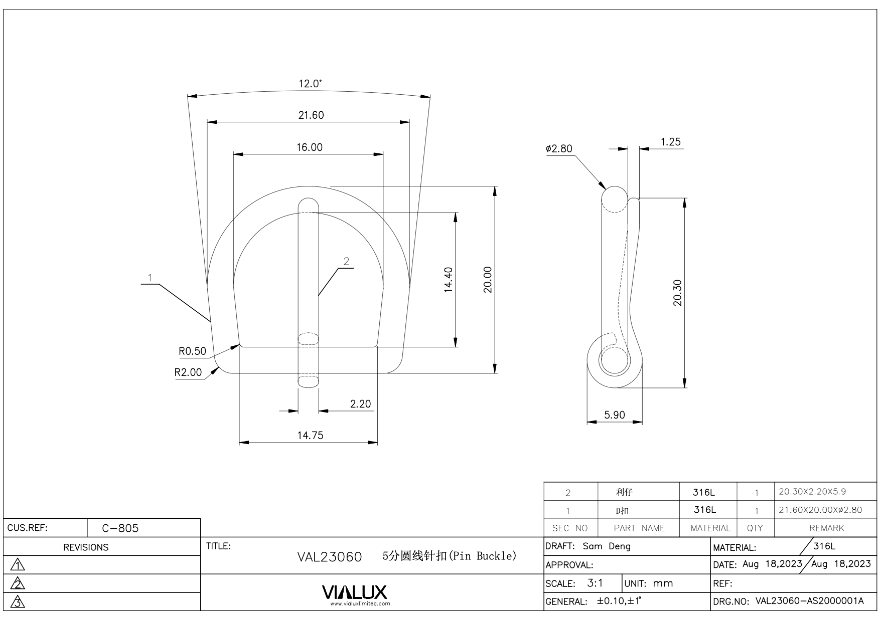 VAL23060 16mm Pin Buckle Stainless Steel Polished